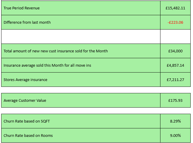 Net sq.ft. result of negative 400 is the worst net result since we opened & we have now finished negative 3 out of the past 4 months, although occupany remains high at over 90% with a limited number of unit sizes to rent.